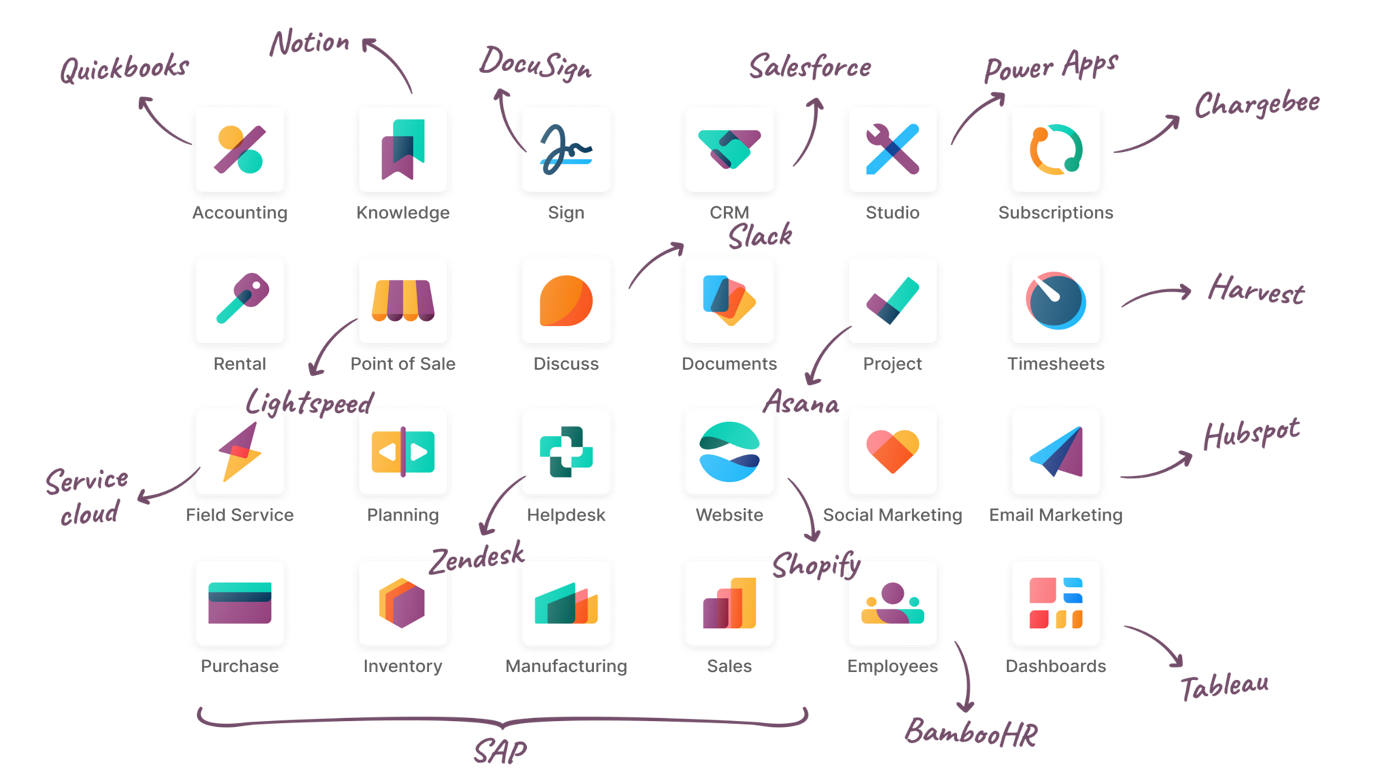 Odoo helpt jou om je bedrijfsprocessen te digitaliseren en te optimaliseren. Elke app, van boekhouding tot voorraadbeheer tot timesheets is perfect met elkaar geconnecteerd. Zo zijn er meer dan 30 applicaties die we op basis van jouw noden kunnen activeren, instellen & aanpassen. Elke Odoo app vereenvoudigt & automatiseert een proces en brengt alles samen in een geïntegreerde oplossing voor zowel zelfstandigen, KMO's alsook grote organisaties.